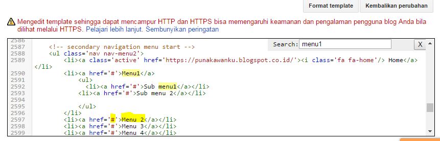 - Tekan Control+F untuk menemukan menu navigasi anda, kemudian masukkan salah satu nama menu navigasi, misal menu1, maka akan muncul seperti gambar ;
