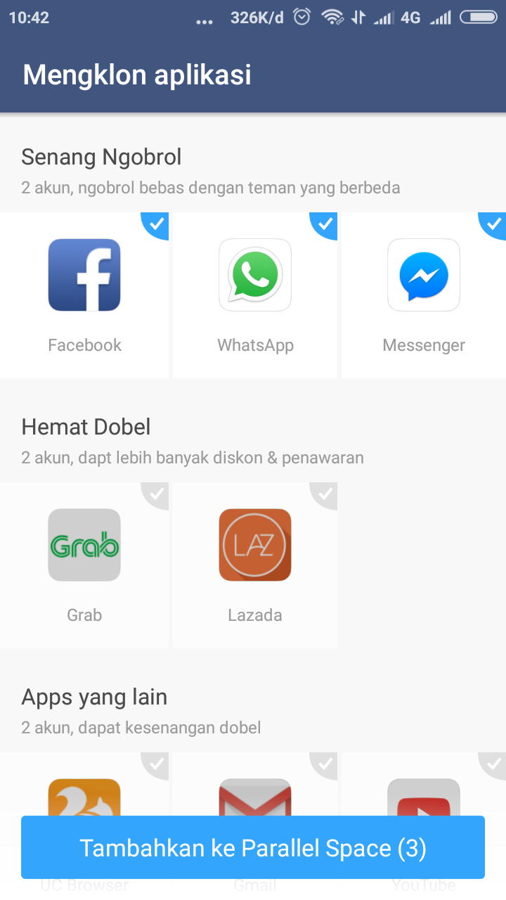 - Setelah itu anda akan disuruh memilih beberapa aplikasi yang akan anda gandakan atau clone. Silahkan centang aplikasi yang akan digandakan. Kemudian tekan Add to Parallel Space/Tambahkan ke parallel space.