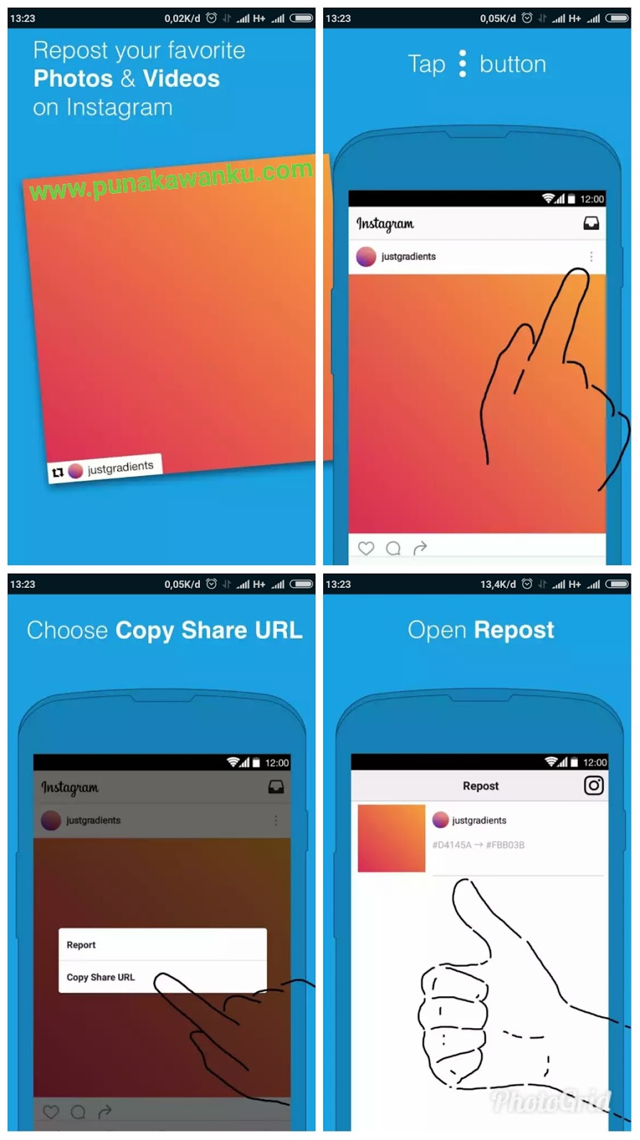 Dalam aplikasi instagram, membagikan foto dan video milik akun instagram lain disebut repost atau regram. Tapi sayang, saat anda menemukan foto atau video yang ingin di bagikan ternyata Instagram tidak memiliki fitur repost.