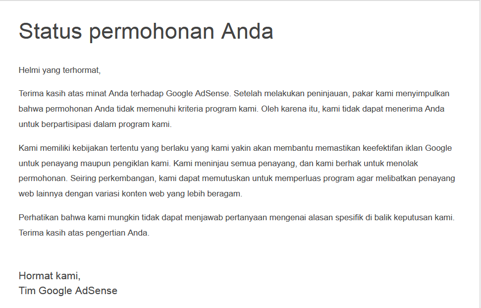 Sip, thanks gan sudah mengingatkan saya dengan dengan penolakan dulu yang saya alami. Kalau dari penolakan seperti digambar, dulu saya pernah ngalamin dan disebabkan karena setelah email penolakan, langsung saya ajukan kembali saat itu juga tanpa melakukan perbaikan. Jadi alasannya seperri itu, tidak spesifik.